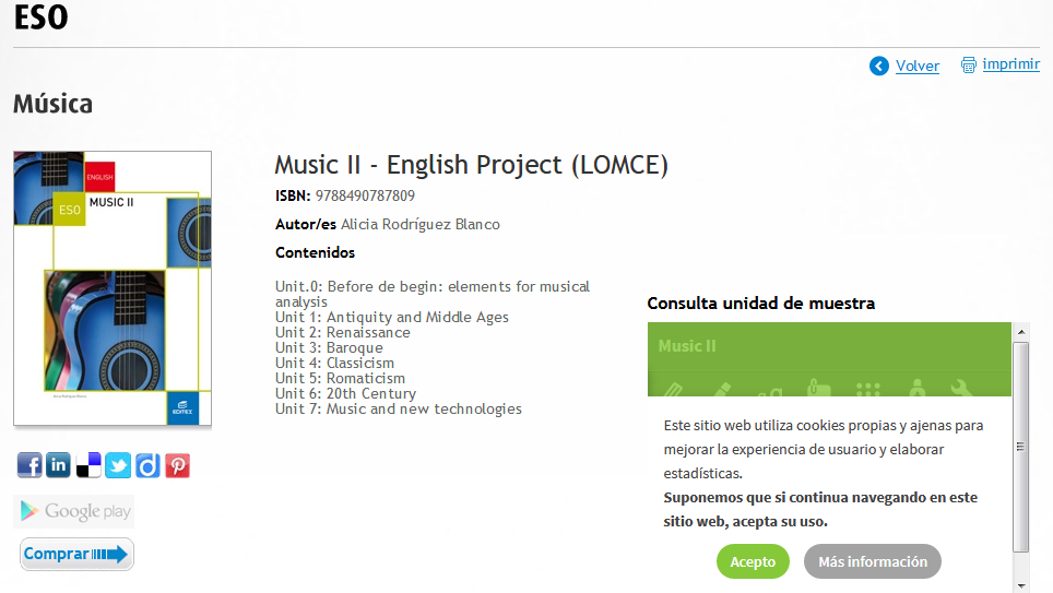 La editorial Editex tiene actualmente en su catálogo libros de texto para la ESO: Music I y Music II.